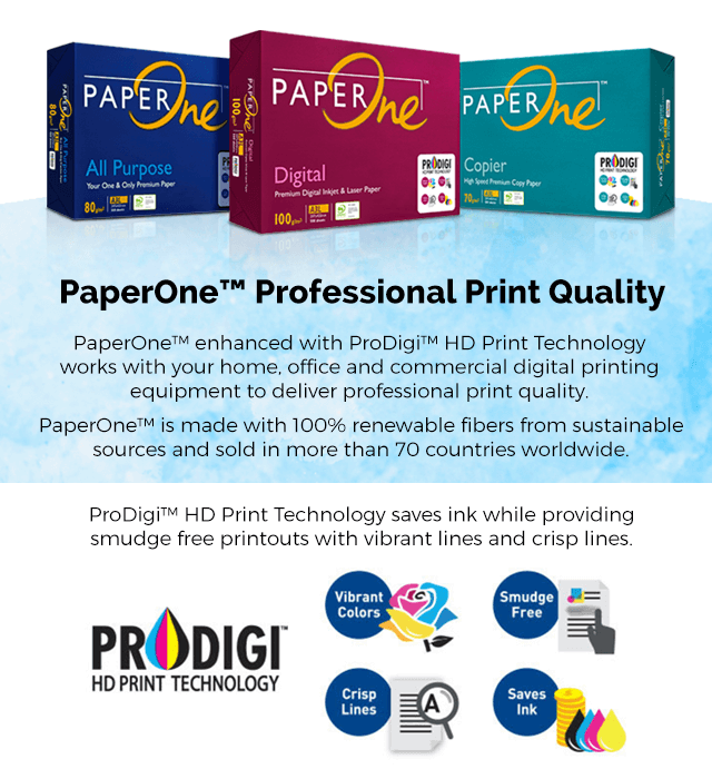 ProDigi™ HD Print TechnologyPaperOne™는 이제 수년 간의 연구 끝에 개발된 독점 기술을 ProDigi™ HD Print Technology로 향상되어 잉크 사용량을 최소화하면서 번짐이 없는 최고의 인쇄 성능을 제공합니다. ProDigi™ HD 인쇄 기술에 대해 자세히 알아보십시오. |